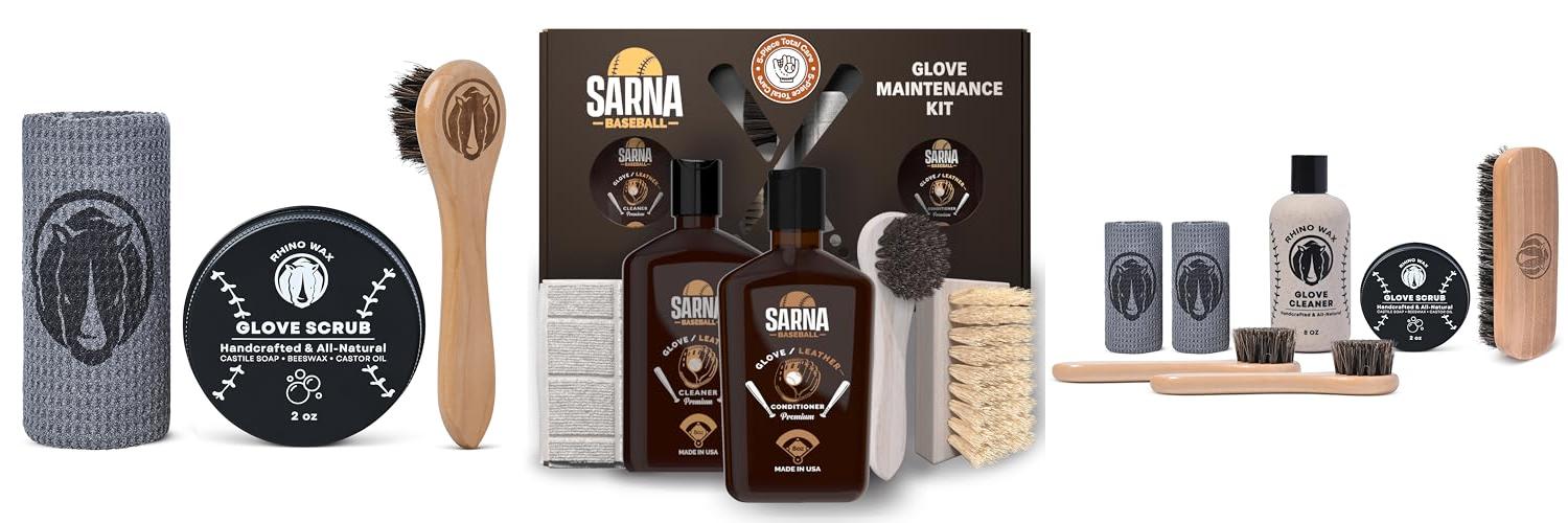 The Rhino Wax Baseball Gloves Complete Cleaning Kit is made to keep your baseball glove in top shape. It has everything you need to clean your glove. The kit includes a scrub for tough dirt, a gentle cleaner for regular use, brushes, and soft cloths. It’s made in the USA and designed to make your glove last longer.