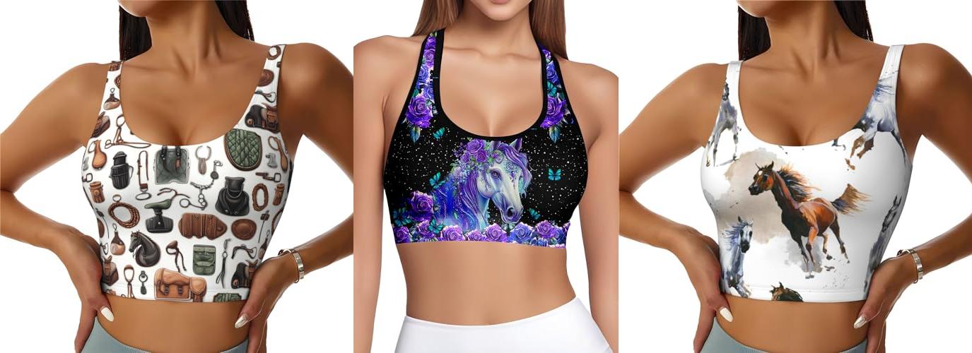 5. Sports Bras for Women High Support – Horse Riding Equipment Print Athletic Running Crop Workout Tank Top Black