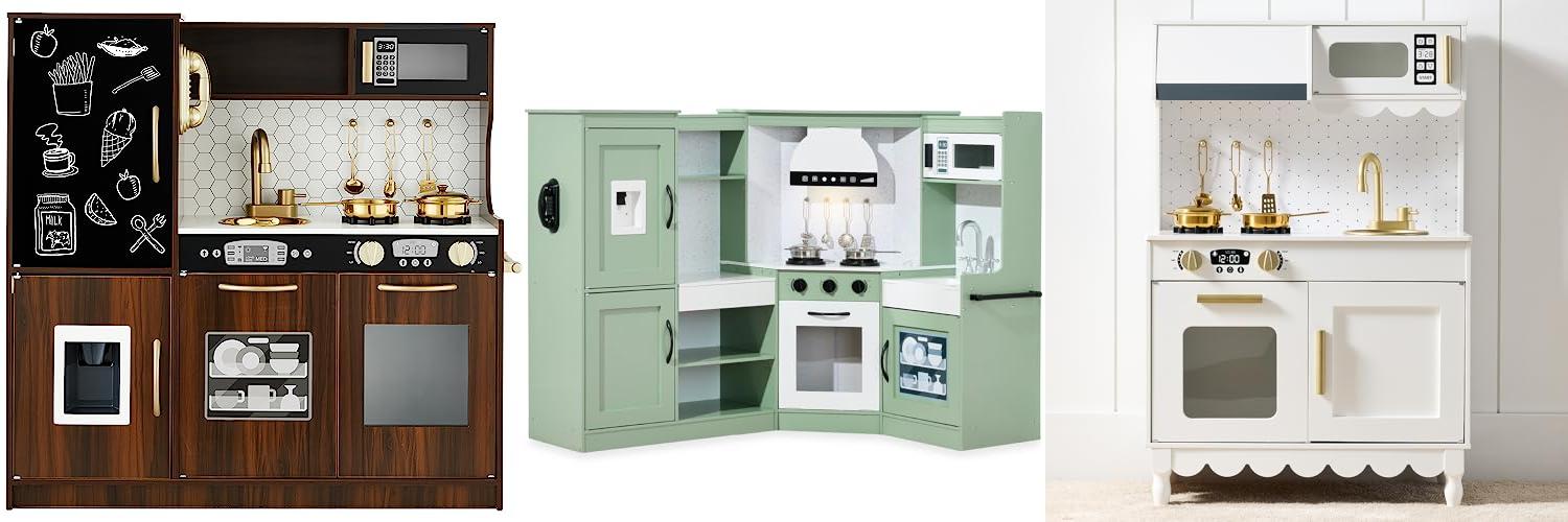 - Wood: Wood kitchens are often sturdy and strong. They can handle lots of play.