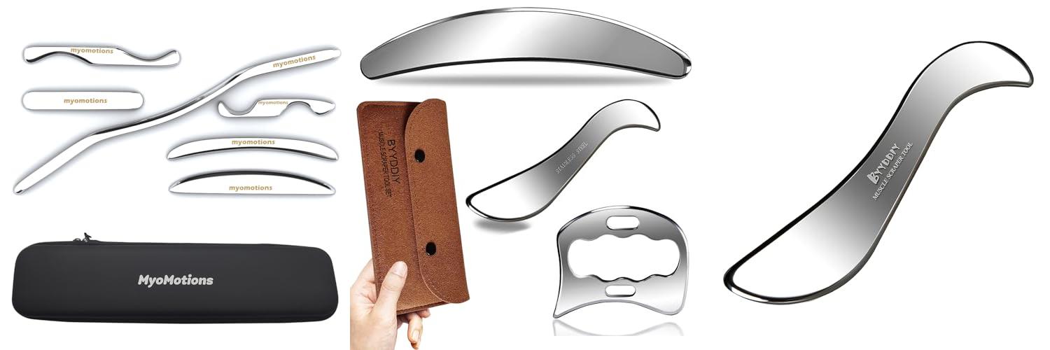 1. myomotions 6-Piece Stainless Steel Iastm Set – Muscle Scraper Massage Tool for Deep Tissue by myofascial Release Tool Comes with a Storage Bag