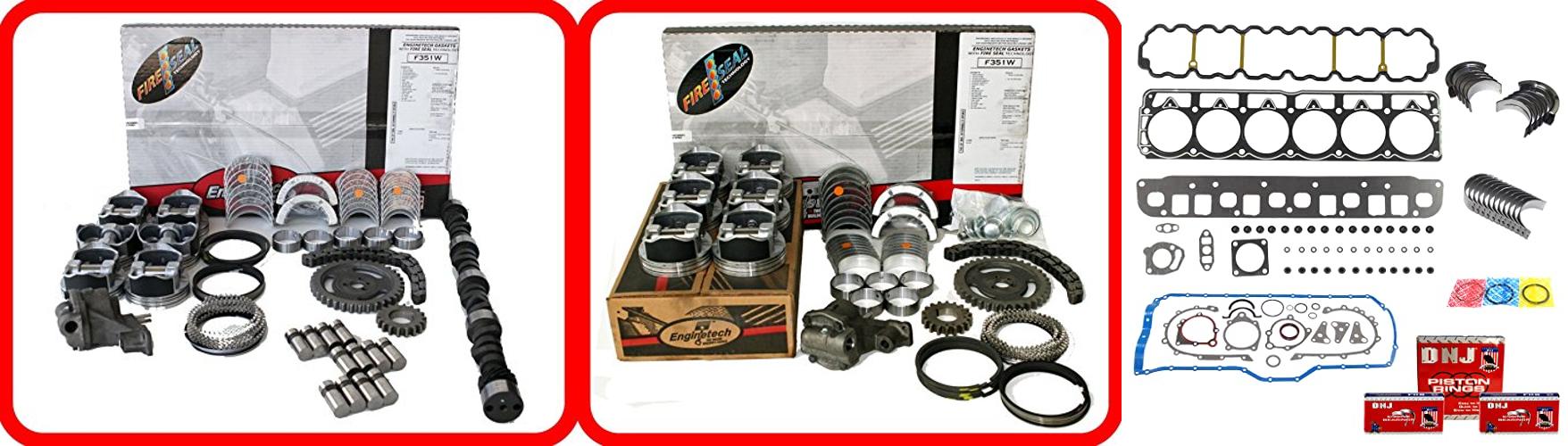 - This kit includes a full gasket set, pistons, piston rings, bearings, timing set, oil pump, camshaft, lifters, freeze plugs, and valve stem seals.