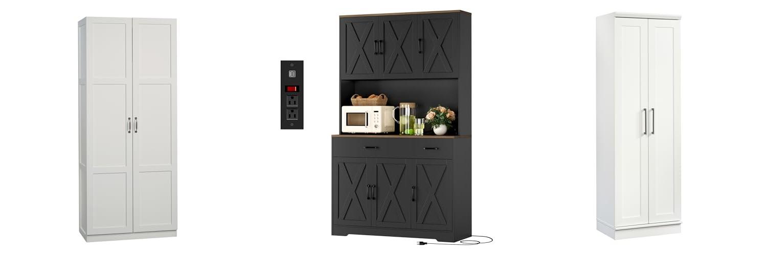 The HOSTACK 71″ Pantry Cabinet is a stylish and practical storage solution. This tall black kitchen pantry cabinet has a charging station. It also has a microwave stand and farmhouse style. The cabinet adds storage to your kitchen, living room, or dining room. It combines modern and classic design elements for a beautiful look.